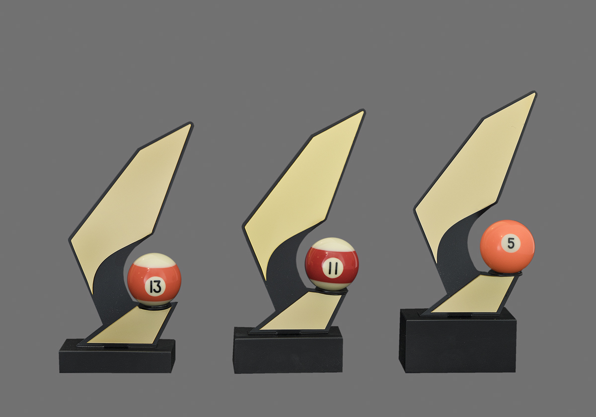Troféu com design desportivo, ideal para competições de bilhar e snooker. Acabamento cuidado e aspeto profissional.